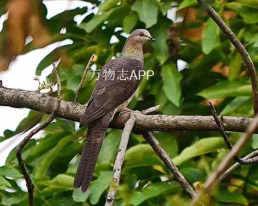 斑尾鹃鸠体长38厘米,是体大而尾长的褐色鹃鸠。背及尾满布黑色或褐色横斑。头灰,颈背呈亮蓝绿色。胸偏粉,…