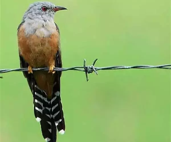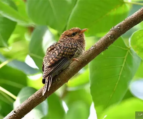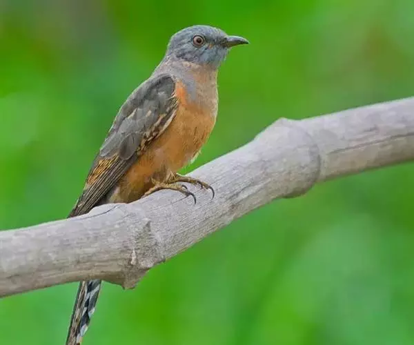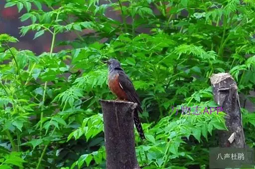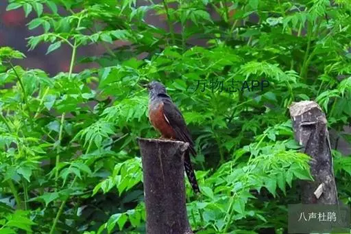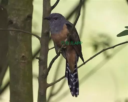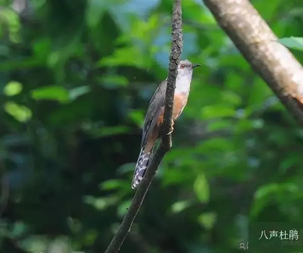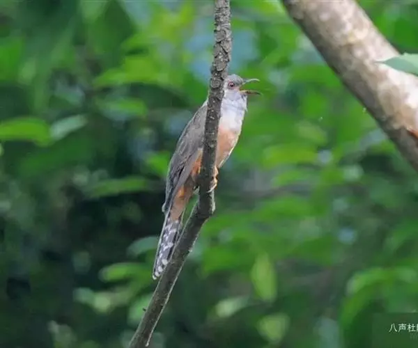 八声杜鹃(学名:Cacomantis merulinus)小型鸟类,体长21~25厘米。嘴形侧扁、尖削。雄鸟头、颈和上胸灰色,背至尾暗灰色,尾具白色端斑。胸以下淡棕栗色,上下体均无横斑。叫声为八声一度。雌鸟通体为灰黑色和栗色相间。相似种棕腹杜鹃体型较大,尾具黑色横斑和红褐色端斑,胸、腹棕栗色,腹以下白色,区别甚明显,野外不难辨别。