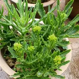 叶子:倒卵形或楔形,具短尖,3-4cm长,2-2.5cm宽,3-5mm厚,淡绿色,多少具白霜,叶缘和叶尖通常泛红。 花:萼片上升到蔓延,近等长;花冠直立,长12 - 15毫米,黄色。