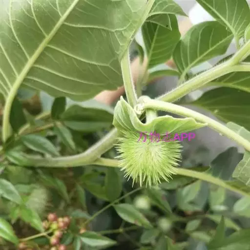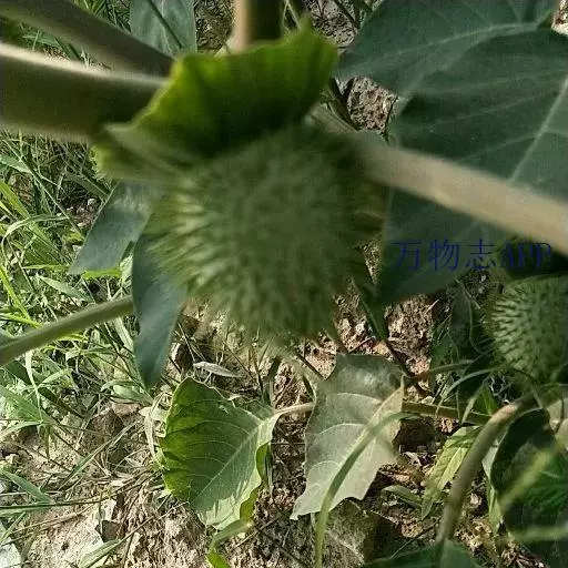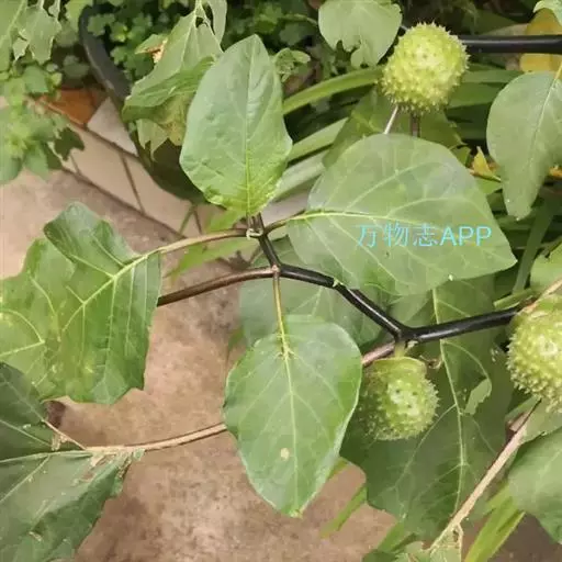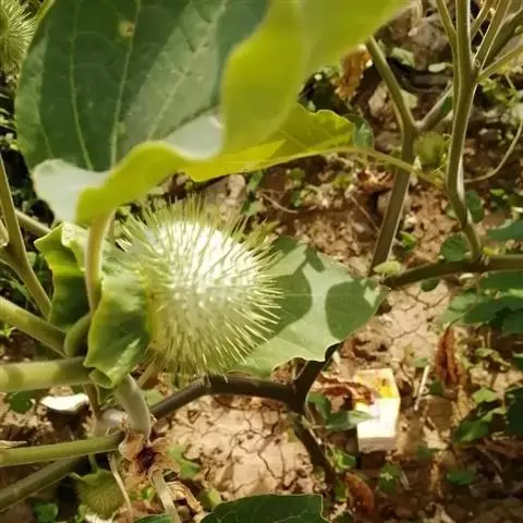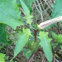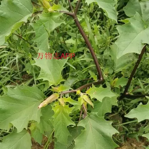 花单生在叶腋或枝叉处;花萼5齿裂筒状,花冠漏斗状,白色至紫色。蒴果直立,表面有硬刺,卵圆形。种子稍扁肾形,黑褐色。