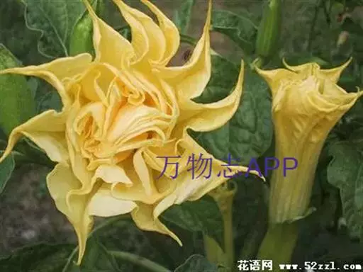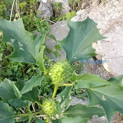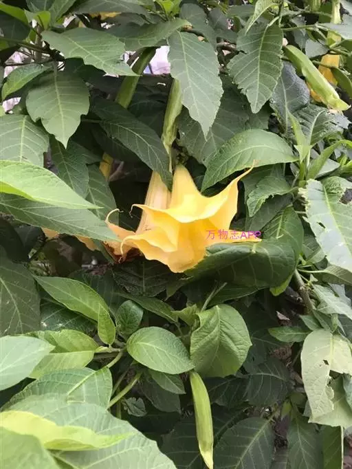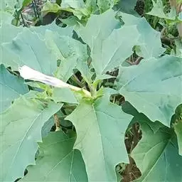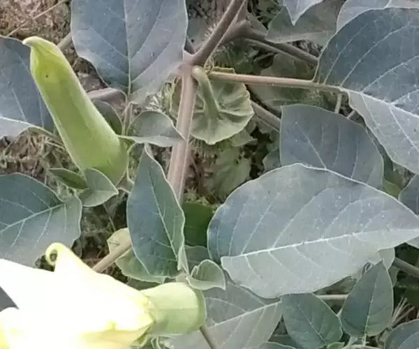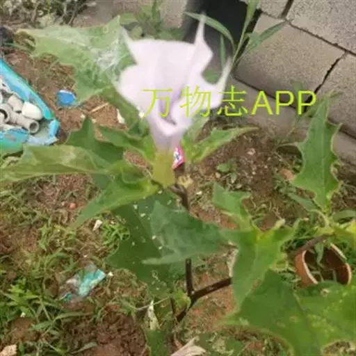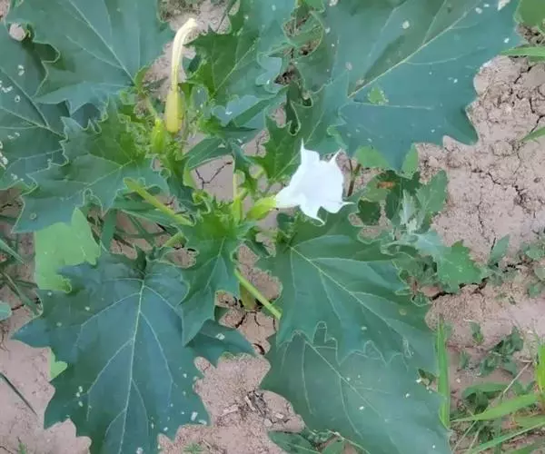曼陀罗花又叫洋金花、大喇叭花、山茄子,夕颜,果实名为:狗核桃、毛苹果。为茄科植物,原产印度,花期5-9月,果期6-10月,喜温暖、向阳及排水良好的砂质壤土。多野生在田间、沟旁、道边、河岸、山坡等地方,主要危害棉花、豆类、薯类、蔬菜等,有剧毒。