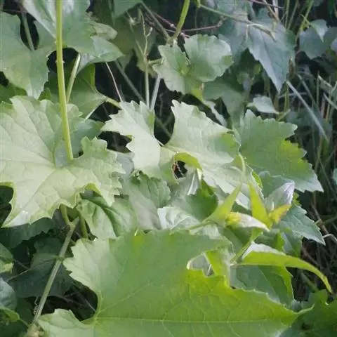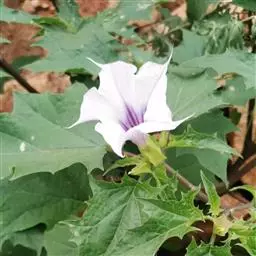叶宽卵形,边缘有规则波状浅裂,基部常歪斜。花单生叶腋,花冠漏斗形,长7-10cm,筒部淡绿色,上部白色;,有时幼叶上有疏毛。上部常呈二叉状分枝。叶互生,叶片宽卵形,边缘具不规则的波状浅裂或疏齿,具长柄,脉上生有疏短柔毛。