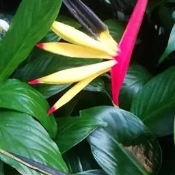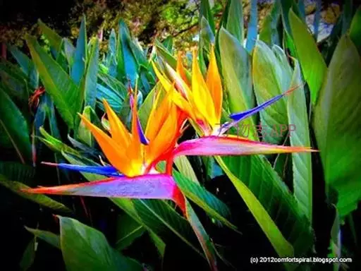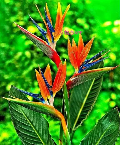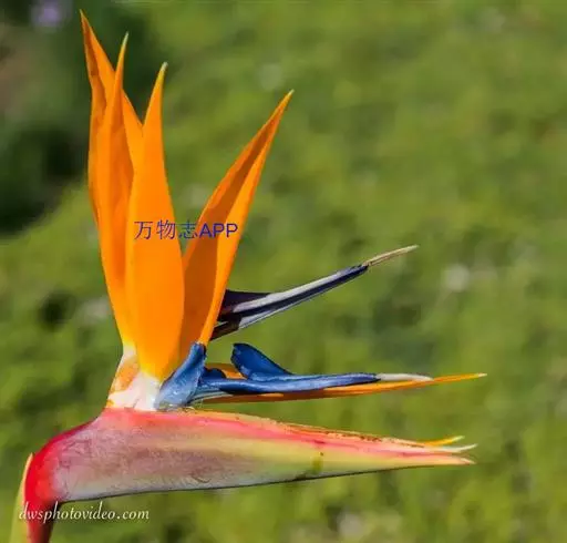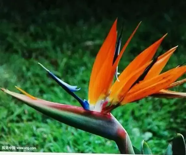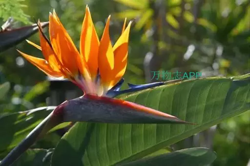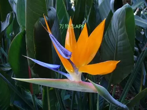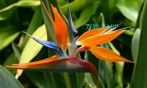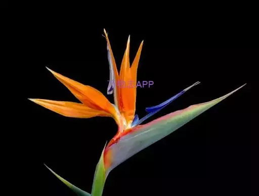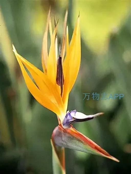 鹤望兰(Strelitzia reginae Aiton)芭蕉科鹤望兰亚科 多年生草本植物,无茎。叶片长圆状披针形,长25-45cm,宽10cm。叶片顶端急尖;叶柄细长。花数朵生于总花梗上,下托一佛焰苞;佛焰苞绿色,边紫红,萼片橙黄色,花瓣暗蓝色;雄蕊与花瓣等长;花药狭线形,花柱突出,柱头3。花期在冬季。