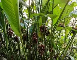 花数朵生于一约与叶柄等长或略短的总花梗上,下托一佛焰苞;佛焰苞舟状,长达20厘米,绿色,边紫红,萼片披针形,长7.5-10厘米,橙黄色,箭头状花瓣基部具耳状裂片,和萼片近等长,暗蓝色;雄蕊与花瓣等长;花药狭线形,花柱突出,柱头3。