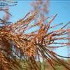 1、症状 柳杉赤枯病主要危害1~4年生苗木的枝叶。一般要苗木下部首先发病,初为褐色小斑点,后扩大并变成暗褐色。病害逐渐发展蔓延到上部枝叶,常使苗木局部枝条或全株呈暗褐色枯死。在潮湿的条件下,病斑上会产生许多稍突起的黑色小霉点,这便是病菌的子座及着生在上面的分生孢子梗及分生孢子。 病害也可直接危害绿色主茎或从小枝、叶扩展到绿色主茎上,形成暗褐色或赤褐色稍下陷的溃疡斑,如果发展包围主茎1周,则其上部即枯死。有时主茎上的溃疡斑扩展不快,但也不易愈合,随着树干的直径生长逐渐陷入树干中,形成沟状病部。这种病株虽不一定枯死,但易遭风折。 2、病原 (1)分类地位及形态:柳杉赤枯病由真菌中半知菌亚门尾孢属的Cercospora sequoiae (C.cryptomeriae Shirai) 所引起,分生孢子梗聚生于子座上,稍弯曲,黄褐色。分生孢子鞭状,但先端较钝,有3~5个分隔(少数有6~9个分隔),淡褐色,表面有微小的疣状突起。 (2)病菌生态学特性:孢子于15~30℃下发芽良好,25℃为发芽最适温度;在92%~100%的相对湿度下才能萌发。 3、发生发展规律 (1)越冬、传播与侵染:病菌主要以菌丝在病组织内越冬,第二年春(约4月下旬至5月上旬)产生分生孢子,由风雨传播,萌发后经气孔侵入,约3周后出现新的症状,再经7~10天左右病部即产生孢子进行再次侵染,严格禁止病苗外调。 4、防治措施 (1)合理施肥,培育无病状苗:施肥要合理,氮肥不宜偏多,提高苗木抗性,培育无病状苗。 (2)药剂防治:发病期间用0.5%的波尔多液、401抗菌剂800倍液及25%的多菌灵200倍液,每2周喷1次。