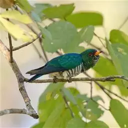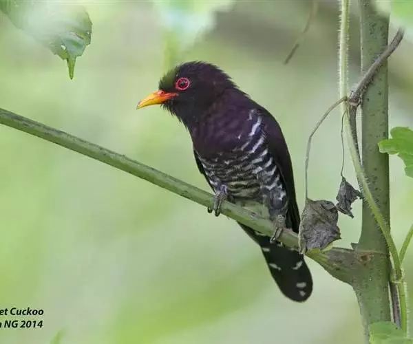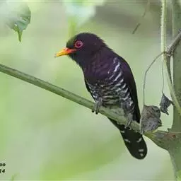 紫金鹃(学名:Chrysococcyx xanthorhynchus)是一种羽色艳丽的小形杜鹃,体长约17厘米。雄鸟头、颈、胸和上体辉紫色,腹白色,具紫蓝色横斑;雌鸟上体淡铜绿色,下体白色,具淡褐色横斑。而相似种翠金鹃雄鸟上体和胸辉绿色,腹白色而具绿色光泽;雌鸟头顶至后颈棕栗色,其余上体铜绿色。区别甚明显。