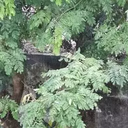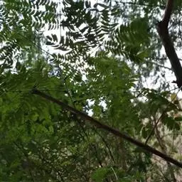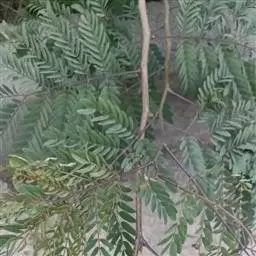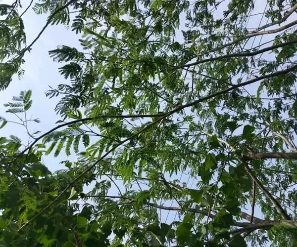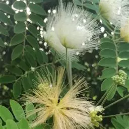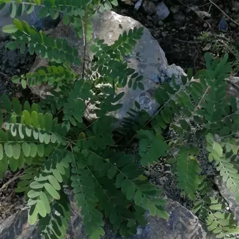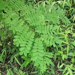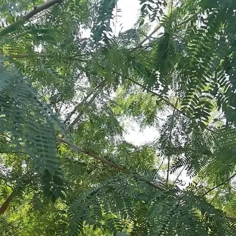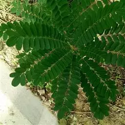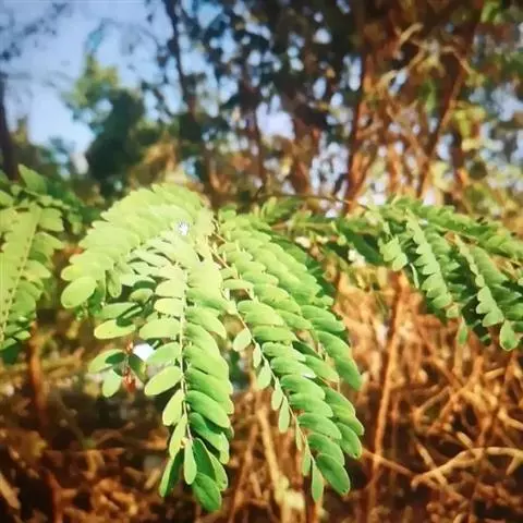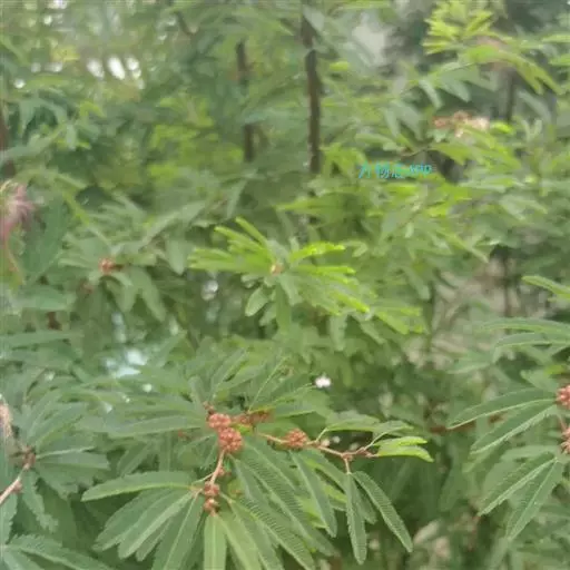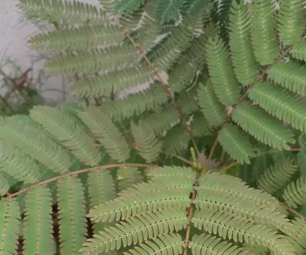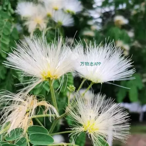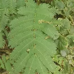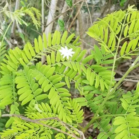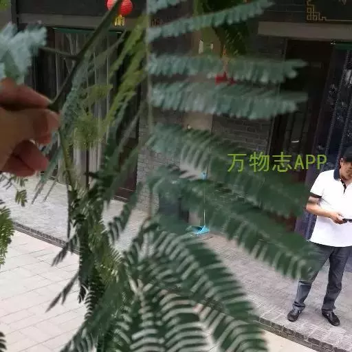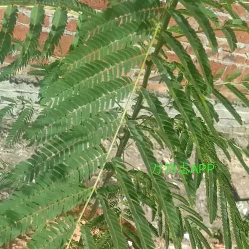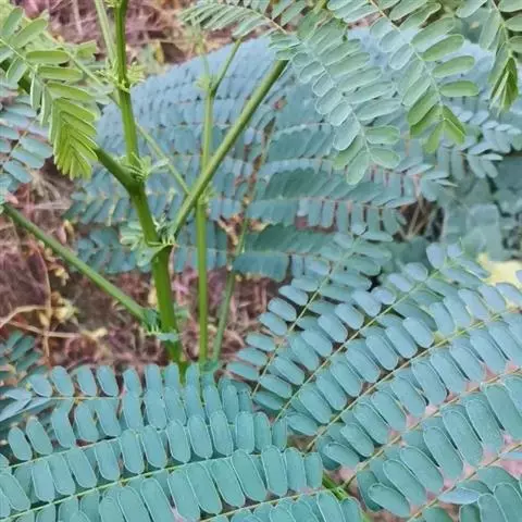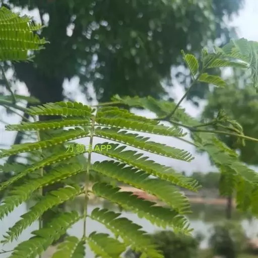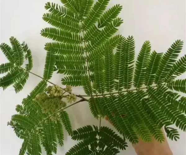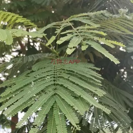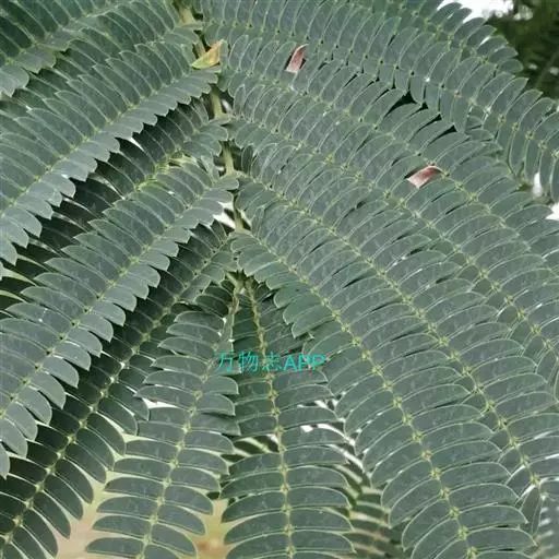 二回羽状复叶,总叶柄近基部及最顶一对羽片着生处各有1枚腺体;羽片4-12对,栽培的有时达20对;小叶10-30对,线形至长圆形,长6-12mm,宽1-4mm,向上偏斜,先端有小尖头,有缘毛,有时在下面或仅中脉上有短柔毛;中脉紧靠上边缘。