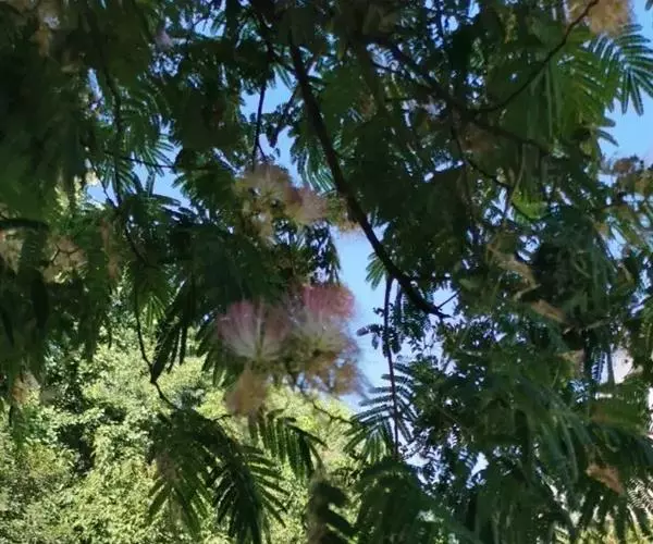 合欢花花丝粉红色,荚果偏,是城市行道树、观赏树。心材黄灰褐色,边材黄白色,耐久,多用于制家具;嫩叶可食,老叶可以洗衣服;树皮供药用,有驱虫之效。它还有宁神作用,主要是治郁结胸闷、失眠健忘、滋阴补阳、眼疾、神经衰弱等功效。