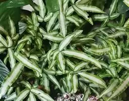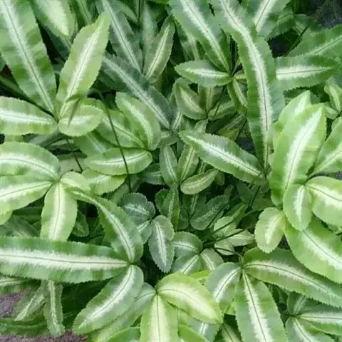 白羽凤尾蕨(学名:Pteris ensiformis Burm. var.victoriae Bak.)是凤尾蕨科,凤尾蕨属蕨类植物,植株高可达50厘米。根状茎细长,斜升或横卧,叶密生,二型;与叶轴同为禾秆色,稍光泽,光滑;叶片长圆状卵形,对生,稍斜向上,上部的无柄,下部的有短柄;羽片中央沿主脉两侧各有1条纵行的灰白色带。小羽片对生,密接,无柄,斜展,长圆状倒卵形至阔披针形,顶生羽片基部不下延,叶干后草质,灰绿色至褐绿色,无毛。