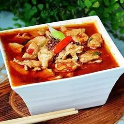 5. 红油入锅烧至七八成热,倒入一不锈钢盆中,随浆好鱼片及味碟上桌。