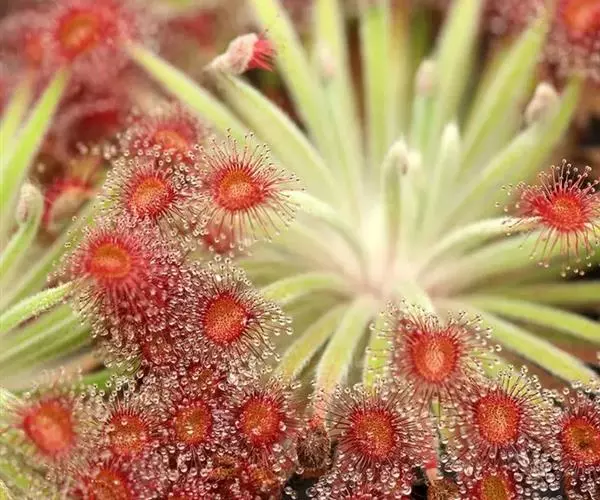 多叉茅膏菜 绝大部分的茅膏菜都比较喜阳、耐暴晒,应尽量每天提供4小时以上的直射光,适合放置于光照良好的阳台或窗户上,若能提供全天的直射光则会呈现出非常鲜艳的颜色,粘液也会变得更加粘稠。若没有良好的光照环境,也应提供全天明亮的散射光,一般除北领地茅膏菜以外的茅膏菜也能正常生长,但植株呈现翠绿色,长势及抗病性都比较差。