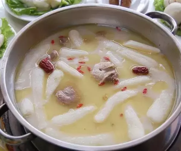 制法:将鹅肉、猪肉分别洗净,放入沸水锅中氽透,捞出,沥干水,切成丝,待用。把淮山药、北沙参、玉竹分别去杂,清水洗净,装入纱布袋中扎口,待用。将煮锅刷洗干净,置于火上,注入鸡汤,放入鹅肉丝、猪肉丝、药袋、精盐、料酒、胡椒粉、生姜片,锅加盖,共煮至肉熟烂,淋上鸡油,以味精调味即成。