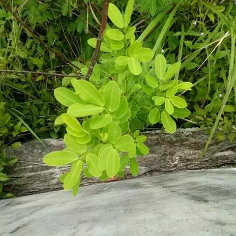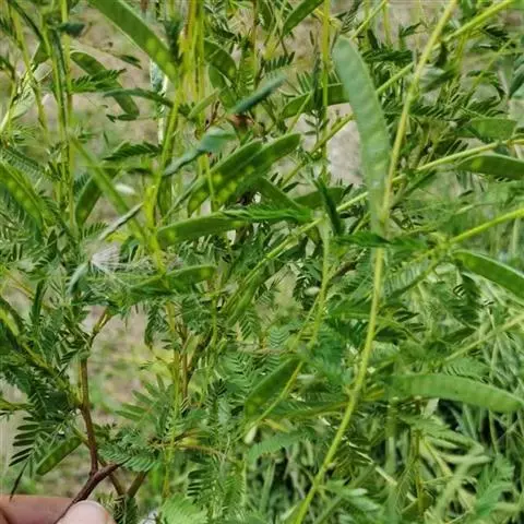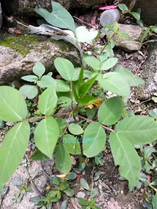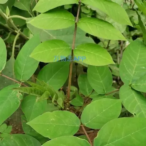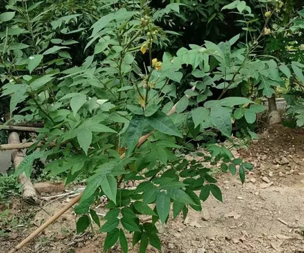 直立、少分枝的亚灌木或灌木,无毛,高0.8-1.5米;枝带草质,有棱;根黑色。叶长约20厘米;叶柄近基部有大而带褐色、圆锥形的腺体1枚;小叶4-5对,膜质,卵形至卵状披针形,长4-9厘米,宽2-3.5厘米,顶端渐尖,有小缘毛;小叶柄长1-1.5毫米,揉之有腐败气味;托叶膜质,卵状披针形,早落。