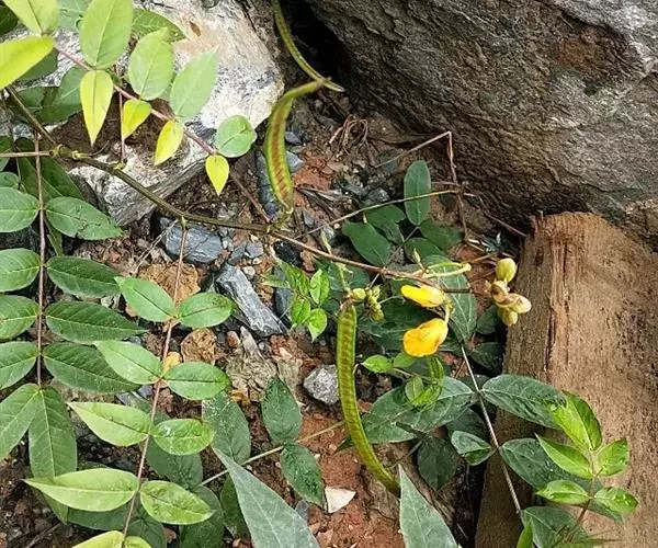 花数朵组成伞房状总状花序,腋生和顶生,长约5厘米;苞片线状披针形或长卵形,长渐尖,早脱;花长约2厘米;萼片不等大,外生的近圆形,长6毫米,内生的卵形,长8-9毫米;花瓣黄色,外生的卵形,长约15毫米,宽9-10毫米,其余可长达20毫米,宽15毫米,顶端圆形,均有短狭的瓣柄;雄蕊7枚发育,3枚不育,无花药。荚果带状镰形,褐色,压扁,长10-13厘米,宽8-9毫来,稍弯曲,边较淡色,加厚,有尖头;果柄长1-1.5厘米;种子30-40颗,种子间有薄隔膜。
