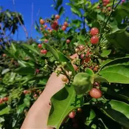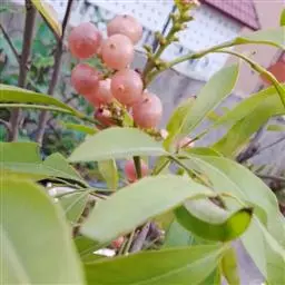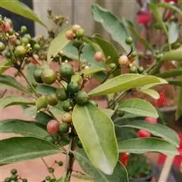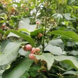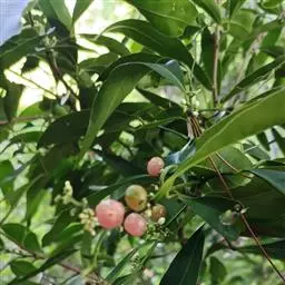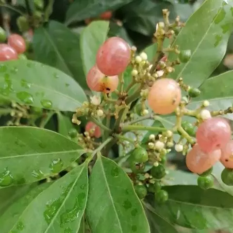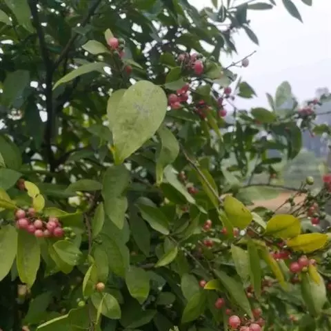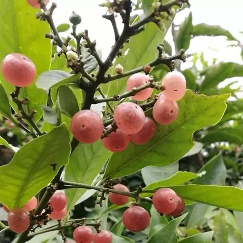 果圆球形或椭圆形,径10—15毫米,淡黄白色转淡红色或暗朱红色,半透明,油点明显,有种子3—2、稀1粒、花期3一5月,果期7—9月。通常除冬、春初季节外常在同一树上有成熟果也同时开花。 [1-2]