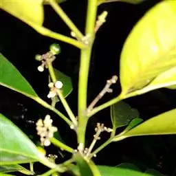 圆锥花序腋生及顶生,通常3—5厘米,很少较短,但顶生的长可达14厘米;花序轴、花梗及萼片常被早脱落的褐锈色微柔毛;萼裂片卵形,端钝,宽约1毫米;花瓣白色,长约4毫米,长椭圆形,较迟脱落,干后变淡褐色,边缘淡黄色;雄蕊10枚,极少8枚,花丝略不等长,上部宽阔,下部稍狭窄,与花药接连处突尖,药隔顶端有1油点;子房阔卵形至圆球形,油点不凸起,花柱极短,柱头稍增粗,子房柄略升起。