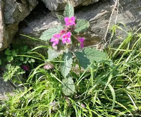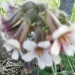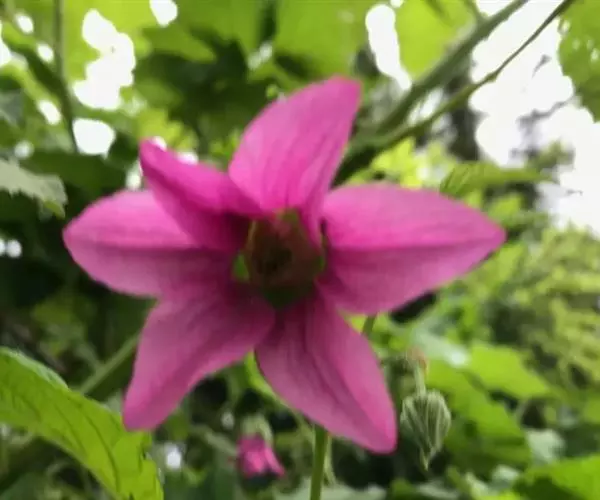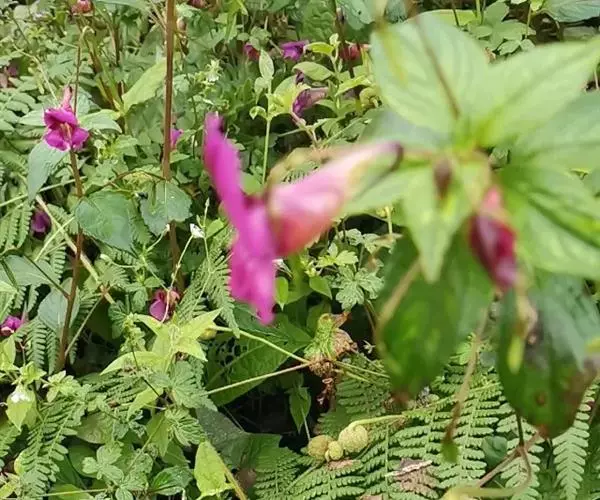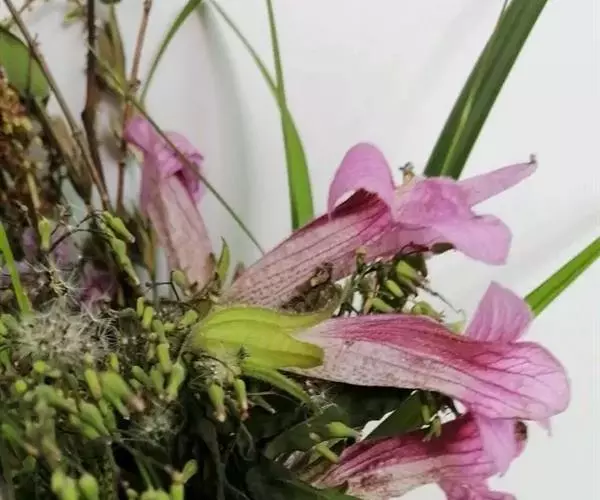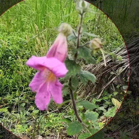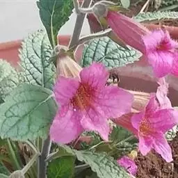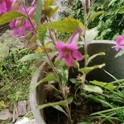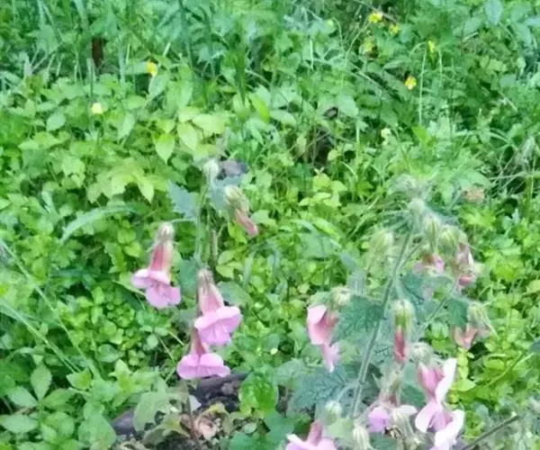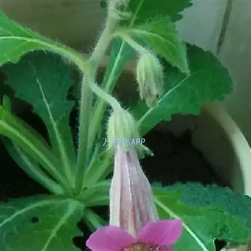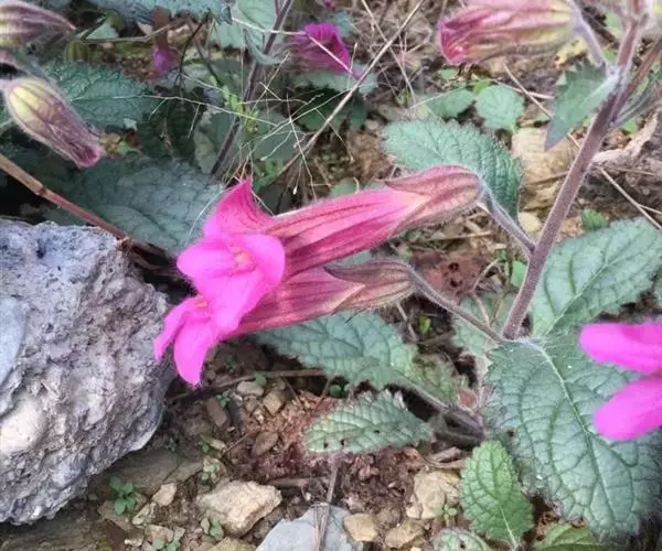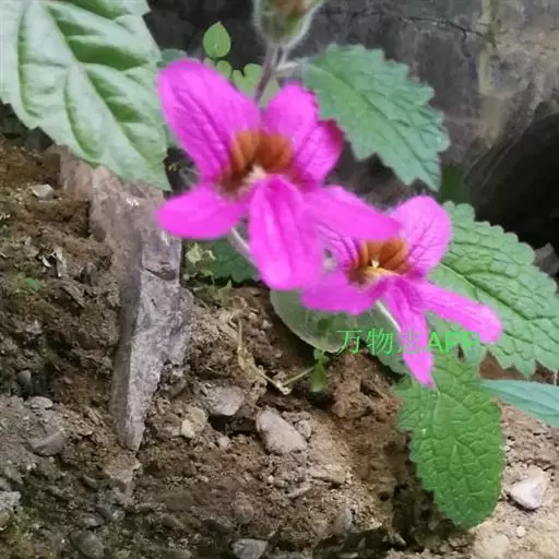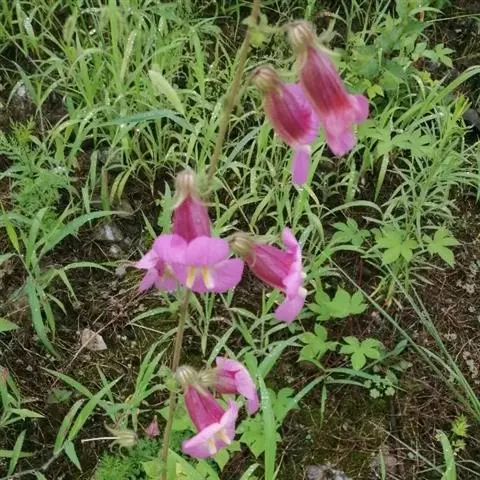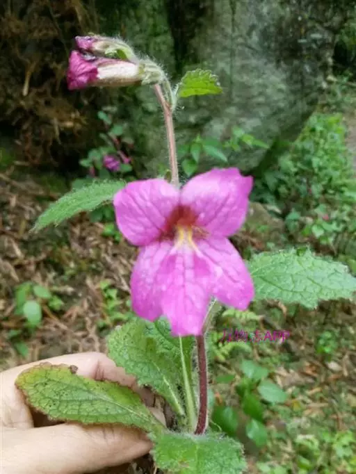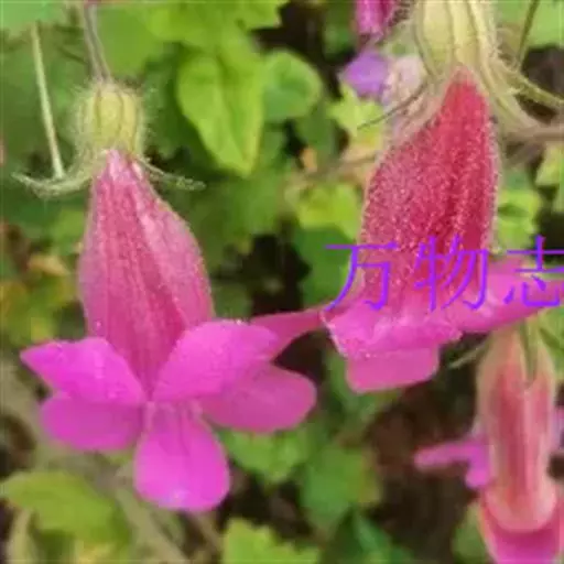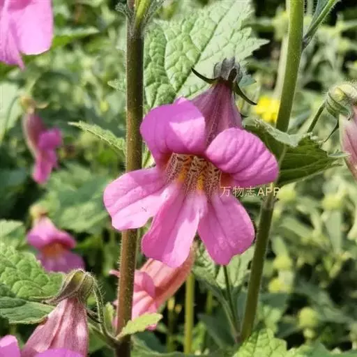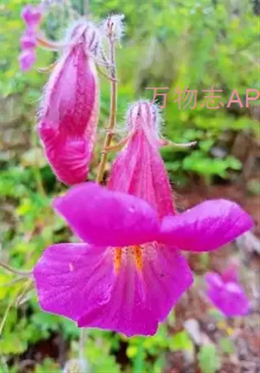花单生,连同花梗总长超过苞片;花梗长1-4厘米,多少弯曲而后上升,与萼同被多细胞长柔毛及腺毛;萼长1-2厘米;萼齿披针形或卵状披针形,先端略尖;后方3枚稍长,中间的1枚长1-1.2厘米,两侧的长0.5-0.8厘米;前方2枚长0.3-0.7厘米,彼此近于相等;花冠紫红色,长5.5-7厘米,外面被多细胞长柔毛;上唇裂片长卵形,先端略尖或钝圆,长1.4-1.8厘米;下唇裂片长椭圆形,先端尖或钝圆,中裂片长约2厘米,宽1.4厘米,侧裂片稍小;雄蕊后方一对稍短,其花丝基部被短腺毛,前方一对稍长,其花丝无毛;药室矩圆形,长约1.5毫米,基部叉开成一直线;花柱顶端扩大,先端尖或钝圆。蒴果卵形,长约1.4厘米,具宿存的花萼及花柱。种子多数,卵形至长卵形,长约1.1毫米,具网眼。花期4-5月,果期5-6月。