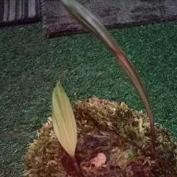 大花盆距兰茎粗壮,长2-5厘米,节间长约1厘米。叶大,带状或长圆形,长11.5-23.5厘米,宽1.5-2.3厘米,先端不等侧2裂,裂片先端稍尖。