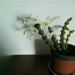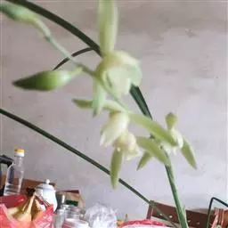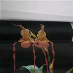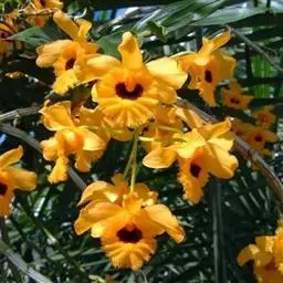 大花盆距兰(学名:Gastrochilus bellinus (Rchb. f.) Kuntze):茎粗壮,长2-5厘米,节间长约1厘米。叶大,带状或长圆形。伞形花序侧生,通常2-3个,具4-6朵花;花大;萼片和花瓣淡黄色带棕紫色斑点,椭圆形,近相似,长12-17毫米,宽6-7毫米,先端圆钝;花瓣比萼片稍小;前唇白色带少数紫色斑点,近肾状三角形,通常多少下弯,长7-10毫米,宽1.5-2厘米,边缘啮蚀状或流苏状,上面除中央的黄色垫状物外密布白色乳突状毛。花期4月。
