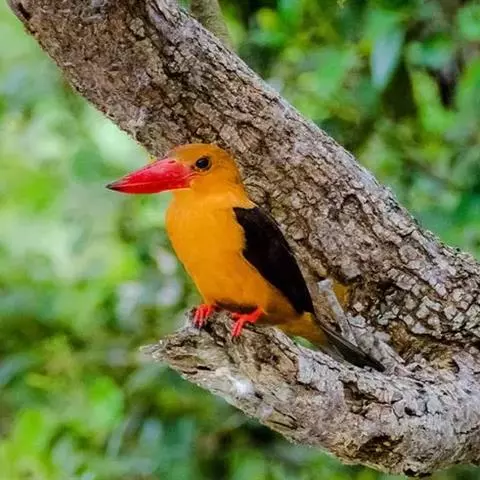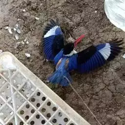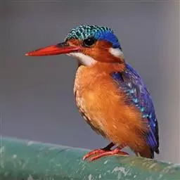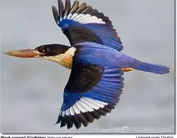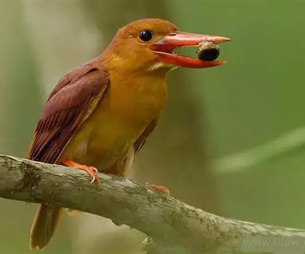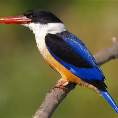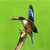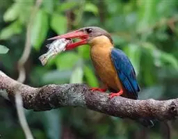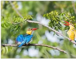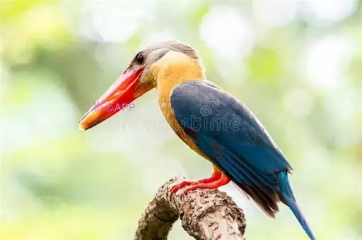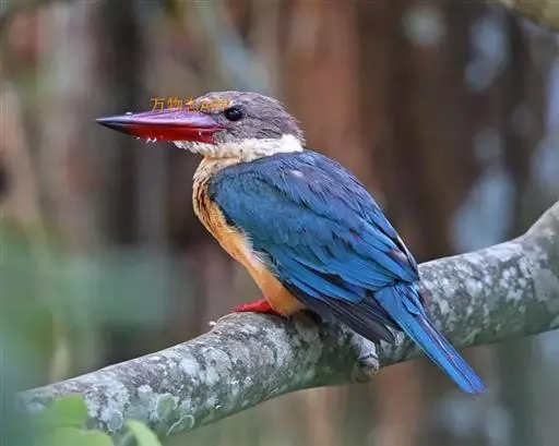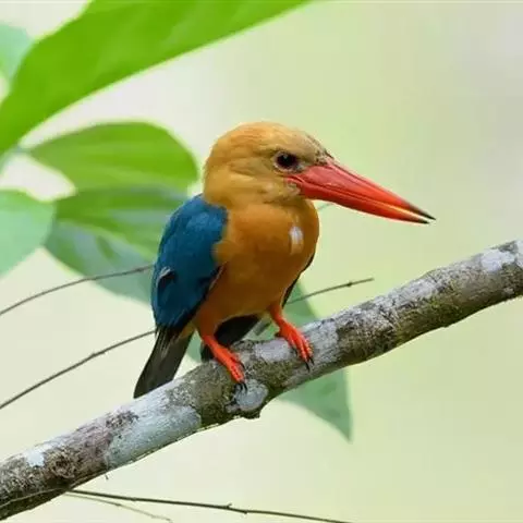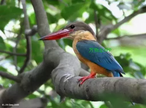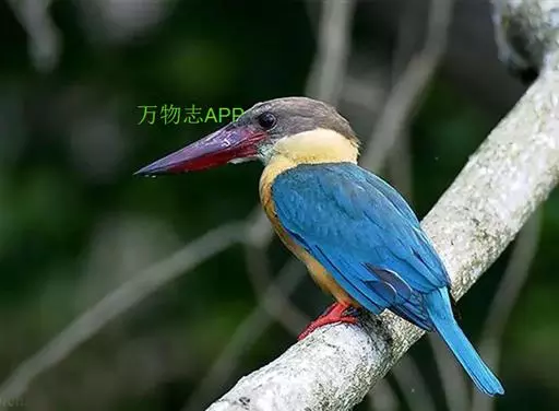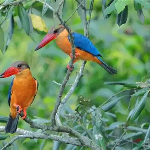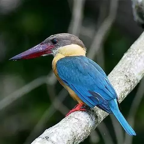 鹳嘴翡翠(学名:Pelargopsis capensis):体长33-37厘米。体重140-200克。共有13个亚种,体型大,嘴形巨大、侧扁,似鹳嘴,红色,嘴峰两侧有鼻沟。头灰褐色,上体蓝色,下体和宽阔的领环赭土色,脚红色。飞翔时翅上无斑。