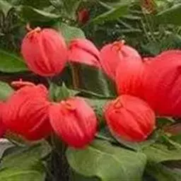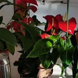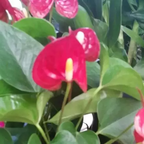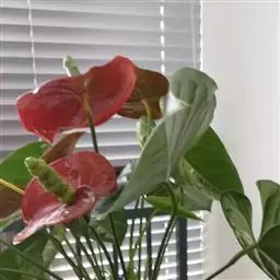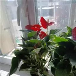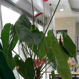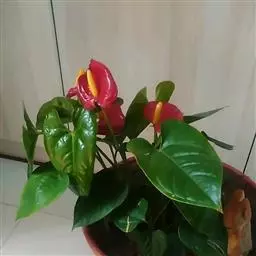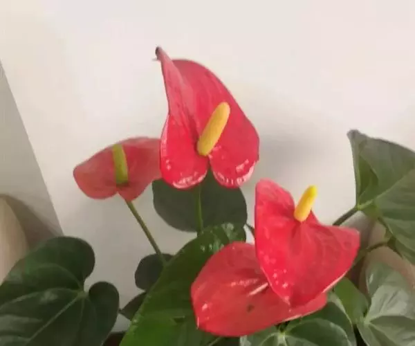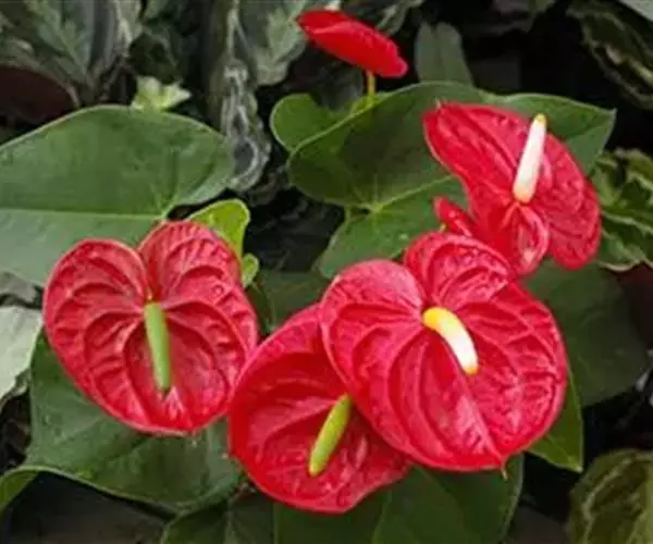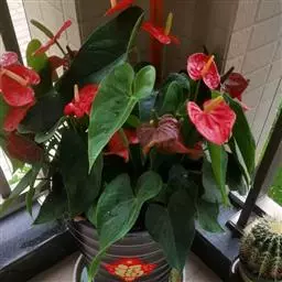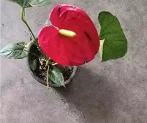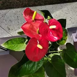 花烛(Anthurium andraeanum Linden):是单子叶植物纲天南星科花烛属多年生常绿草本植物。茎节短;叶自基部生出,绿色,革质,全缘,长圆状心形或卵心形。叶柄细长,佛焰苞平出,革质并有蜡质光泽,橙红色或猩红色;肉穗花序黄色,可常年开花不断。