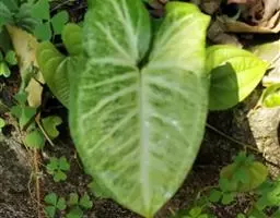 天南星科多年生常绿草本植物。茎节短;叶自基部生出,绿色,革质,全缘,长圆状心形或卵心形,叶柄细长。