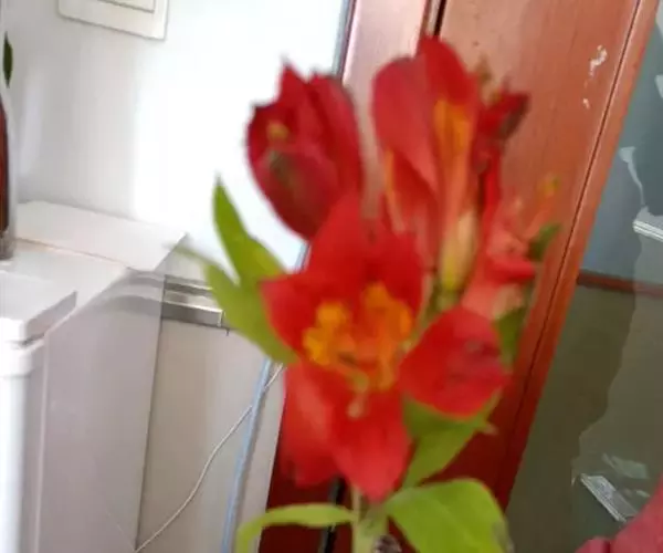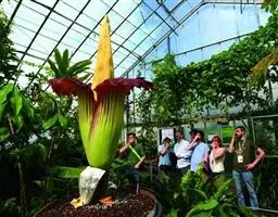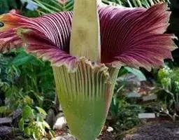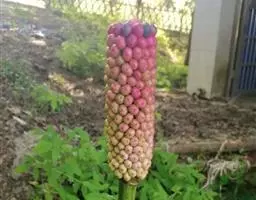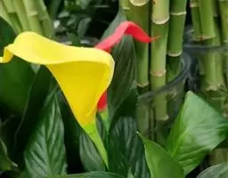 佛焰苞平出,卵心形,革质并有蜡质光泽,橙红色或猩红色;肉穗花序长5-7厘米,黄色,可常年开花不断。