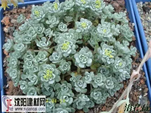 叶子绿色肉质会有白霜覆在表面,故名。易群生。 白霜Sedum spathulifolium ssp.