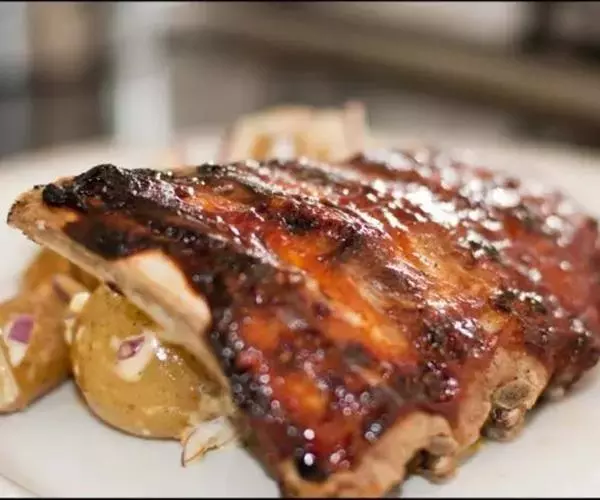 2、再将柠檬汁、鲜橙汁、蜂蜜、辣椒粉、月桂叶加入煮开。放凉后将猪肋排放入腌渍一小时。