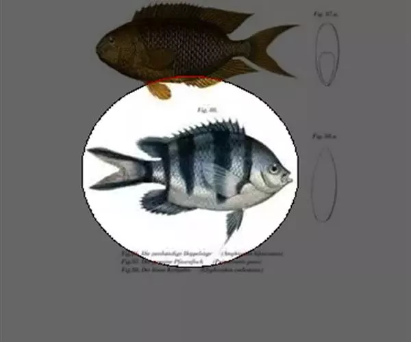 眼斑双锯鱼,背鳍硬棘被橘黄色斑块分割为5-6枚,第4枚最长,约为头长的2.1-2.9倍。胸鳍、臀鳍…
