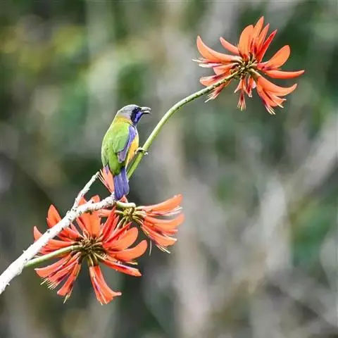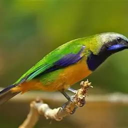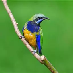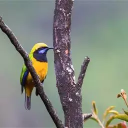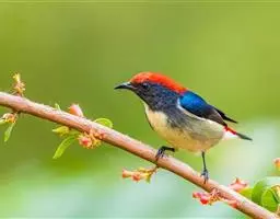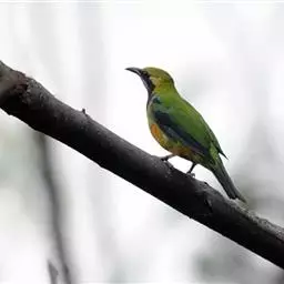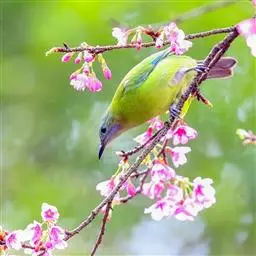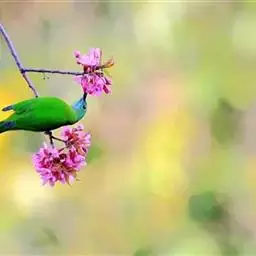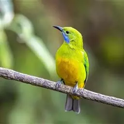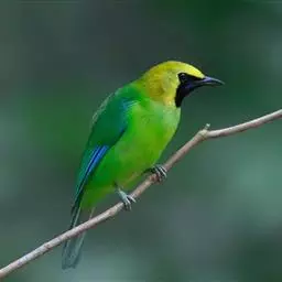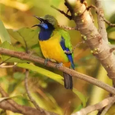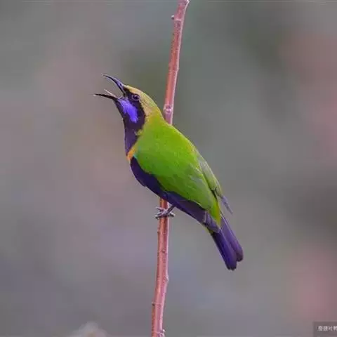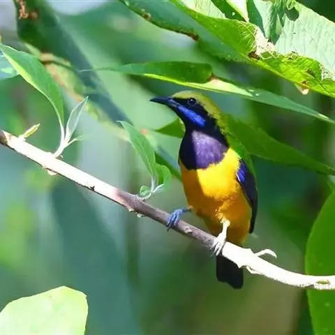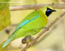 蓝翅叶鹎:小型鸟类,体长15-18厘米。雄鸟通体草绿色,尾蓝绿色,肩和翅亮蓝 色,胸缀有黄色,…