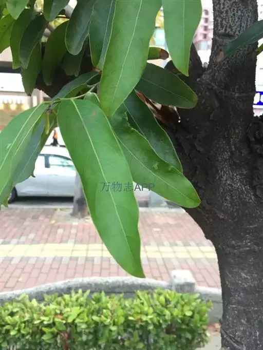 常绿大乔木,高7-20(-30)米;树干通直,树皮灰褐色;小枝粗壮,节部稍膨大。叶薄革质,卵状披针形或卵状长圆形,长10-30厘米,宽3-8厘米,先端长渐尖,基部通常圆形,稀宽楔形,偏斜,边全缘,无毛,上面绿色,下面淡绿色,干后赤褐色,侧脉8-10对,网脉细密,明显;叶柄长1.2-1.5厘米,无毛。