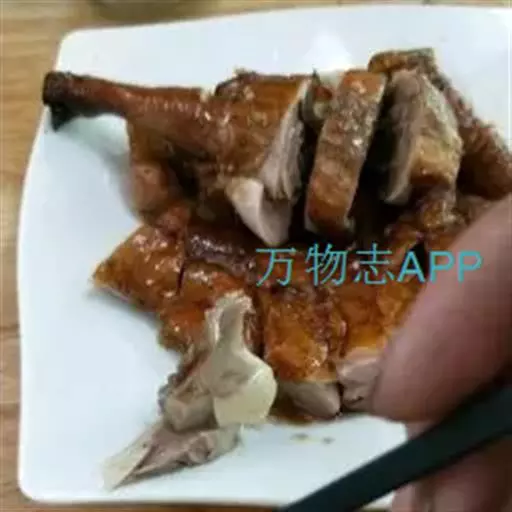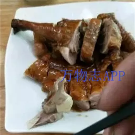 6、将晾干的鹅挂入烤炉中,用果木木炭烧中火慢烤,烤至鹅肉熟透时,改用大火将鹅的表皮烤至酥脆,取出,先倒出鹅腹内的卤汁,将鹅斩件装盘,再淋上卤汁,随酸梅酱味碟上桌蘸食即可。