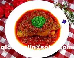 2、用姜末10克、蒜茸10克、葱末20克、精盐15克、白糖20克、料酒30克、生抽10克、芝麻酱10克、鸡精10克、五香粉5克、陈皮粉2克加适量二汤调匀,制成味汁;另将麦芽糖、白醋、大红浙醋、曲酒按1:13:1:1调匀,制成脆皮水(可保存好,多次使用)。