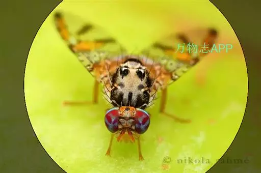 成虫:体长4.5~5.5mm,翅长4.5毫米,体和翅上有特殊颜色,头褐色,额黄色。雄虫具有奇异的银灰色匙形额附器。胸部背面黑色有光泽,镶以黄白色斑纹。翅透明,短而宽,有黄色、褐色和黑色的斑点,并有断续的带纹;中部的带纹延伸到前缘和后缘;外侧的带纹仅延伸到翅的外缘而不及前缘,翅的前缘和基部为深灰色。雄虫前足腿节上侧的毛黑色,雌虫的为黄色。腹部橙红色,有2条红褐色带纹。雌虫产卵器较短而扁平,伸长时可达1.2毫米。卵白色到淡黄色,有光泽,纺锤形,略弯曲,两端尖。长0.9~1.1毫米,宽0.2~0.25毫米。