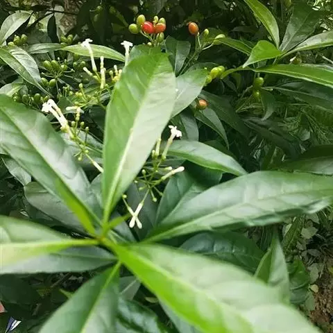 灌木,高达3米。叶纸质,椭圆形或椭圆状披针形,长10-16厘米,宽2.5-6厘米,顶部具尾尖,基部楔形,两面无毛,上面深绿色,具光泽,下面淡绿色;中脉和侧脉在叶面扁平,在叶背凸起,侧脉每边10-14条,斜曲上升,在叶缘网结。聚伞花序顶生,被微毛;总花梗短,长约1厘米,粗壮;花梗长5-7毫米;苞片长约1.5毫米,