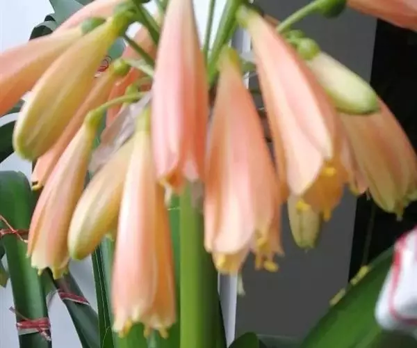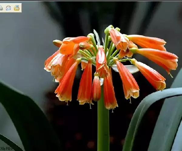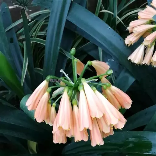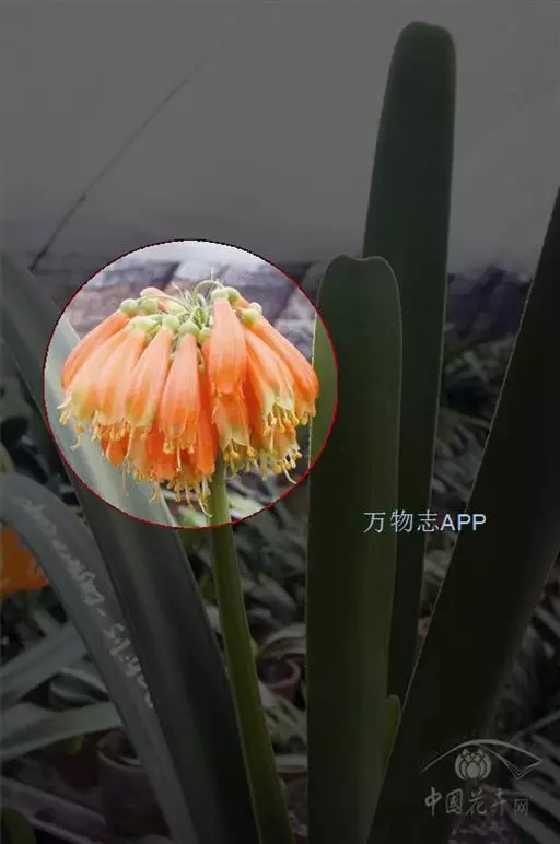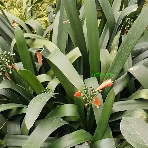 垂笑君子兰高雅肃穆,叶片狭长,花茎稍短叶于叶,花橙黄色,开放时下垂,呈桶状,是春节期间布置会场,点缀宾馆、美化家庭环境的盆栽花卉。