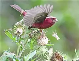 藏朱雀:全长约17-18厘米。雄鸟头部深红色具光辉,喉部暗红色具白色点斑;背部灰白色,各羽具玫瑰红…