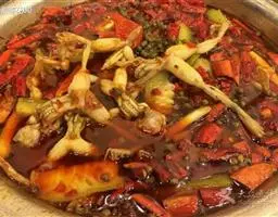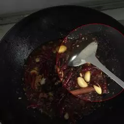 1.锅内放油,多放一点,油稍热后,下姜、蒜、干海椒爆香,