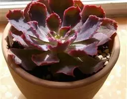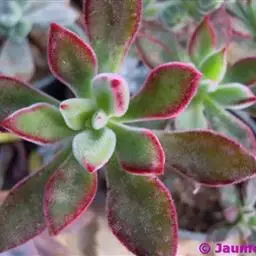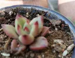 株高5~7厘米,莲座直径一般8~10厘米,老株直径可达20厘米。 叶片肉 露娜莲的花(图:Emmanuelle Aubé) 质,有白色霜粉;卵圆形,先端有小尖,边缘半透明;一般灰绿色,在阳光充足、温差大的环境下变为淡粉色或淡紫色。聚伞花序,花淡红色。 冬季或春季开花。