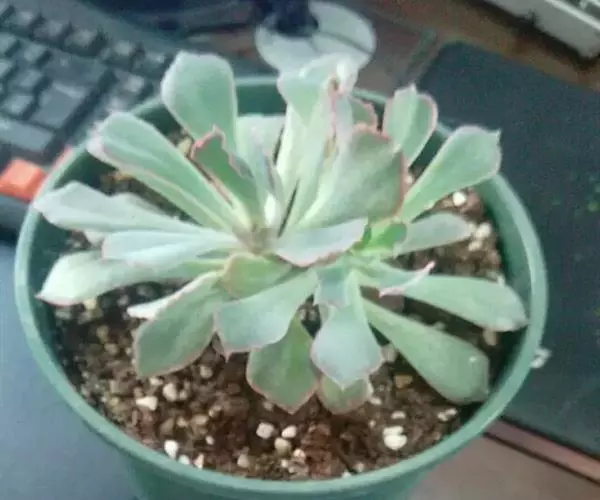 乙姬花笠,肉质叶倒卵形,较大,基部狭窄,叶缘淡红色,有波浪状起伏,叶色灰绿,被有白粉,在阳光较强的条件下叶面呈红色。