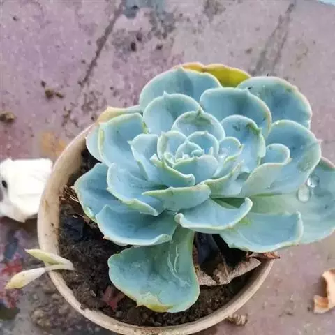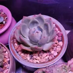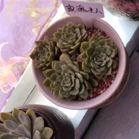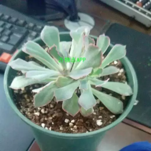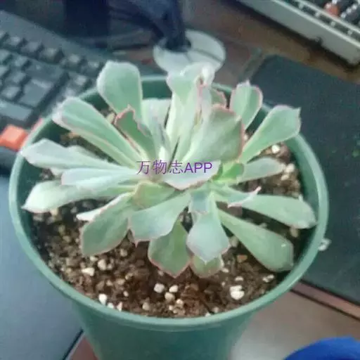 3.美丽莲又名“别露斯”,景天科风车草属植物,紧凑的莲座状叶盘灰绿褐色,被有白粉,花洋红色。