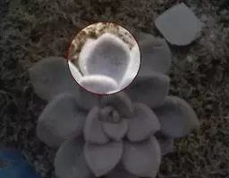 特玉莲,叶长5至7厘米,叶片呈变态匙形,正面稍凸起,背面中间凹,先端内弯,叶缘很厚,最先端有一小尖,叶色蓝绿至灰白,被有浓厚的白粉。