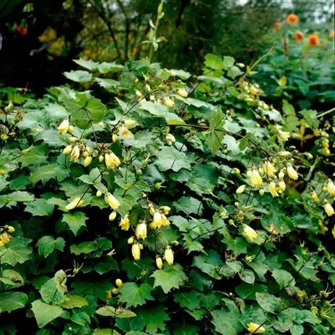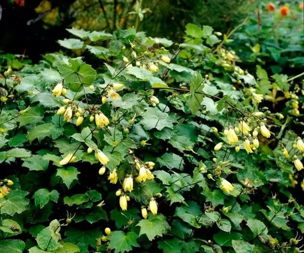 黄山梅(学名:Kirengeshoma palmata Yatabe)是虎耳草科,黄山梅属多年生草本植物,高可达120米。茎直立,无毛,略紫色。叶生于茎下部的最大,叶片为圆心形,裂片具粗齿,叶柄生于茎最下部的最长,生于茎上部的渐短以至于无柄。聚伞花序生于茎上部叶腋及顶端,中部的花最大,苞片披针形;花黄色,花梗中部的较两侧的短,萼筒半球形,花瓣离生,形状稍不等,花柱线形,蒴果阔椭圆形或近球形,种子黄色,扁平,3-4月开花,5-8月结果。