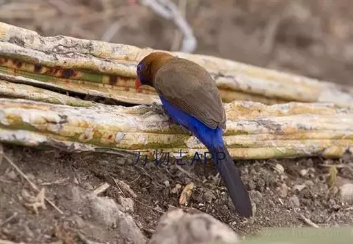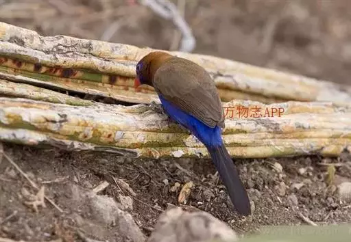 它的头部、喉部、背部及翅膀是深栗色,而 脸部、胸部、腹部 则为紫蓝色,雄鸟 甚至会出现到亮钴色。尾部很长 ( 大 约6.5公分长 )。喙部是粉红色。