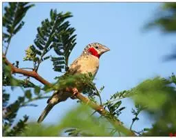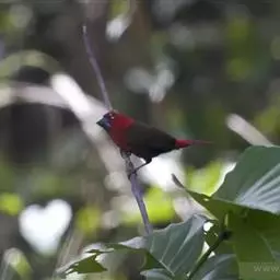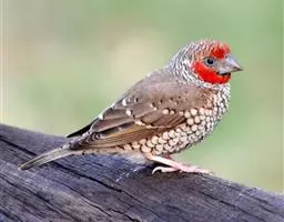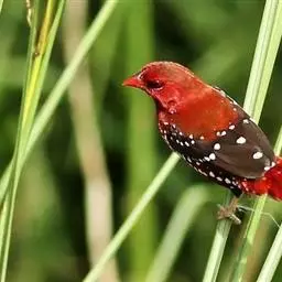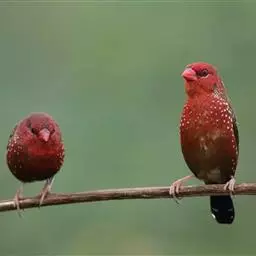 红梅花雀小型鸟类,体长9-10厘米。雄鸟通体朱红色,背、肩、胸等满布白色小斑点,…