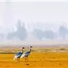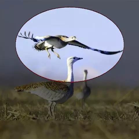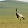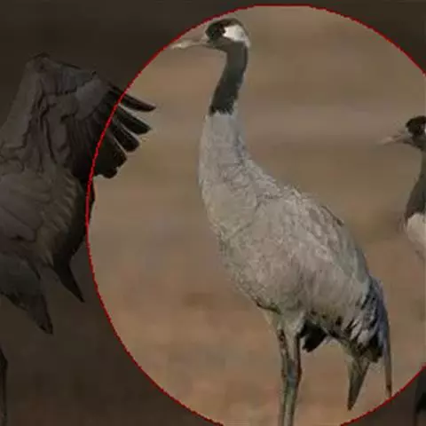 蓑羽鹤(学名:Anthropoides virgo)大型涉禽,体长68~92厘米,是鹤类中个体最小者。通体蓝灰色,眼先、头侧、喉和前颈黑色,眼后有一白色耳簇羽极为醒目。前颈黑色羽延长,悬垂于胸部。脚黑色,飞翔时翅尖黑色。