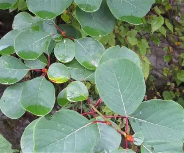 落叶小乔木,高3-5米;除花序有毛外,其余均无毛。小枝绿色,搓之有樟脑味。叶互生,常聚生于枝梢,圆形至宽倒卵形,长6-8厘米,宽5-7厘米,先端圆,基部圆形或楔形,纸质,嫩叶紫红绿色,老叶上面深绿色,下面粉绿色,羽状脉,侧脉每边5-6条,中脉、侧脉在叶两面均突起;叶柄长2-3厘米。伞形花序常生于枝梢,与叶同时开放;总花梗长3-4毫米,被黄色柔毛;每一花序有雄花9-11朵;花梗细长,长1-1.5厘米,有稀疏柔毛;花被裂片6,卵形或宽卵形,长约3毫米,黄色;能育雄蕊9,花丝无毛,第3轮基部的腺体大,有柄,退化雌蕊无毛。果球形,直径5-6毫米;果梗长1-1.5厘米,先端略增粗。花期4-5月,果期8-9月。