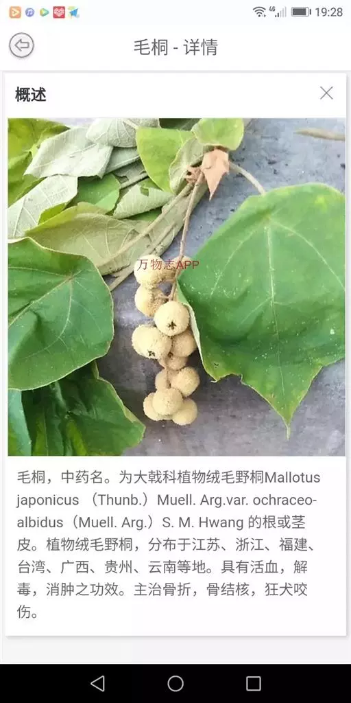 毛桐,中药名。为大戟科植物绒毛野桐Mallotus japonicus (Thunb.)Muell. Arg.var. ochraceo-albidus(Muell. Arg.)S. M. Hwang 的根或茎皮。植物绒毛野桐,分布于江苏、浙江、福建、台湾、广西、贵州、云南等地。具有活血,解毒,消肿之功效。主治骨折,骨结核,狂犬咬伤。