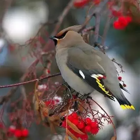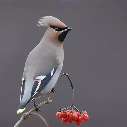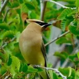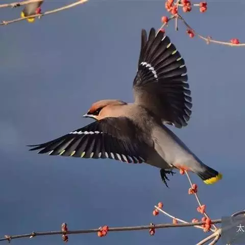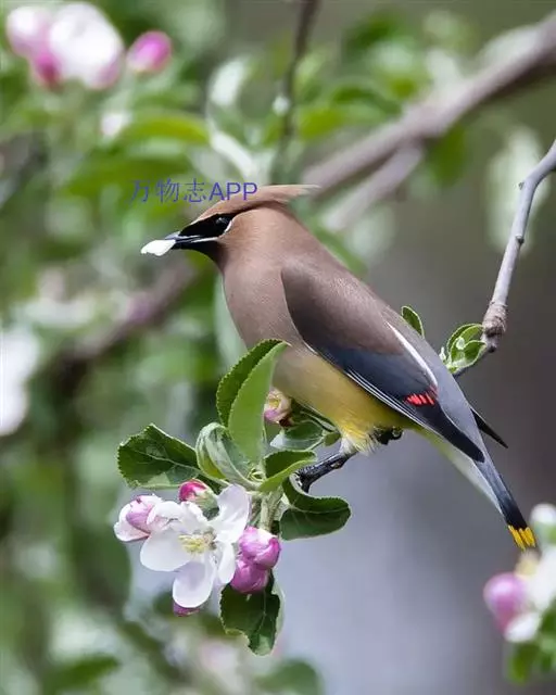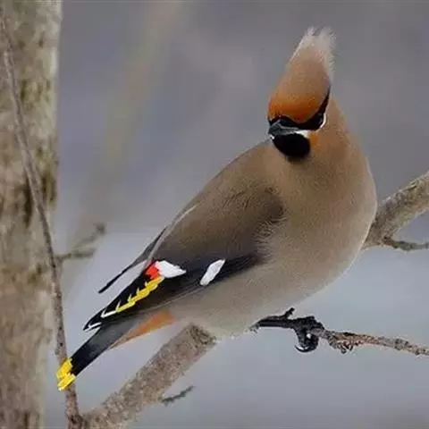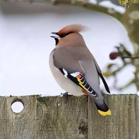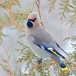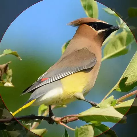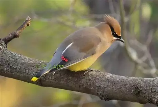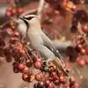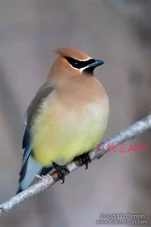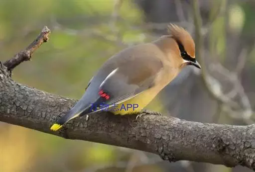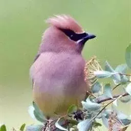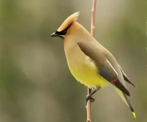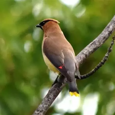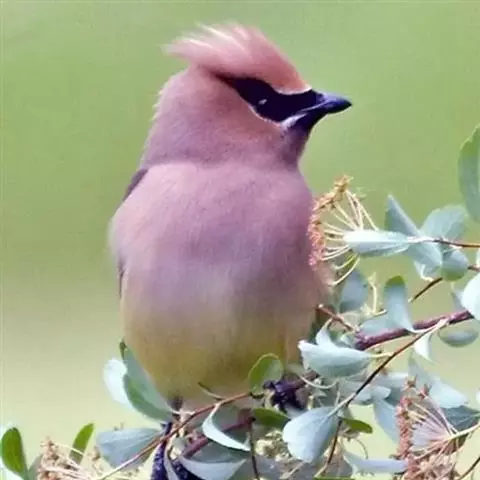雪松太平鸟体形(学名Bombycilla cedrorum:)中等大小,体长约在19厘米左右。该物种雄雌同形同色,太平鸟成鸟额部及面部前端为栗色,向头后部颜色逐渐变浅;额基部、眼先、眼周及眼后部有黑色纹带,颌部亦有黑色区域;枕部黑色,与贯眼的黑色区域相链接,形成环绕头部的黑环;头顶具细长的簇状羽冠,这条羽冠常常覆盖在枕部的黑色羽区上,让人无法看到环绕头部的黑环;体羽松软,头部有一簇柔软的冠羽,嘴短,略呈钩状。喜群居,无领域性,多树栖,以松籽、浆果、昆虫为食。在美洲广泛分布。雪松太平鸟亚成鸟眼后和头枕部没有黑羽,前胸及腹部有明显的褐色带状纹。